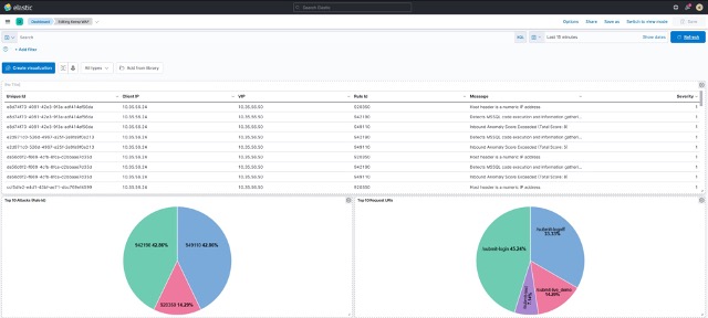 LogStash has parsed the LoadMaster WAF syslog messages and we can see that it has extracted the Client IP, Virtual Service IP, ModSecurity message / severity  / unique IP / attack type etc. fields. With this information available, we can use Kibana to build visualizations as shown in Figure 9.