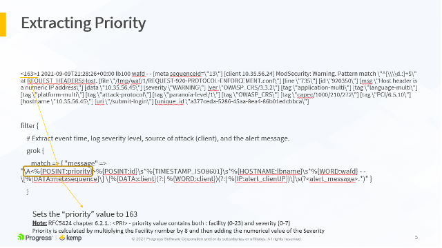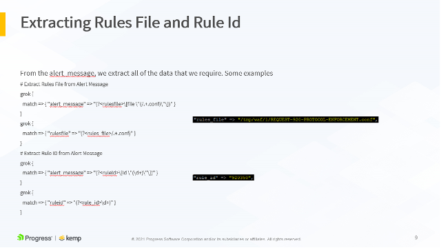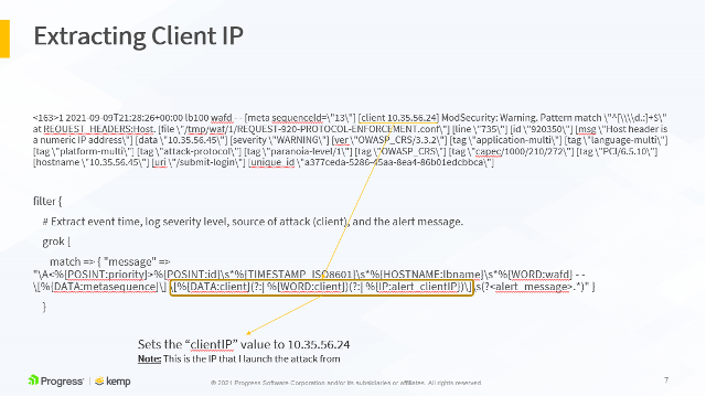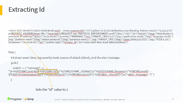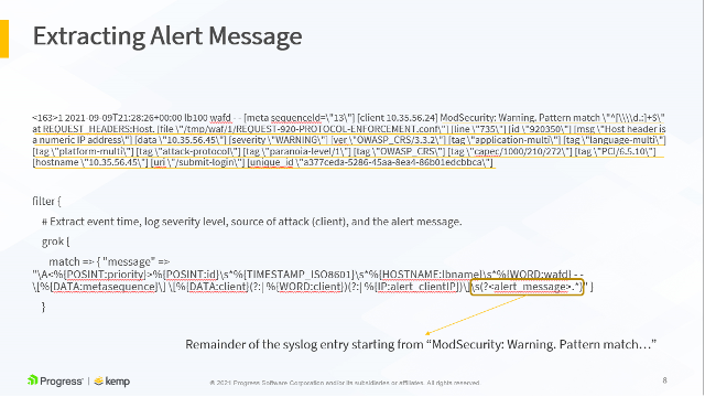 The following slides show an example LoadMaster WAF syslog output and how it maps to the LogStash configuration above. This is further detailed in the accompanying video, available here.