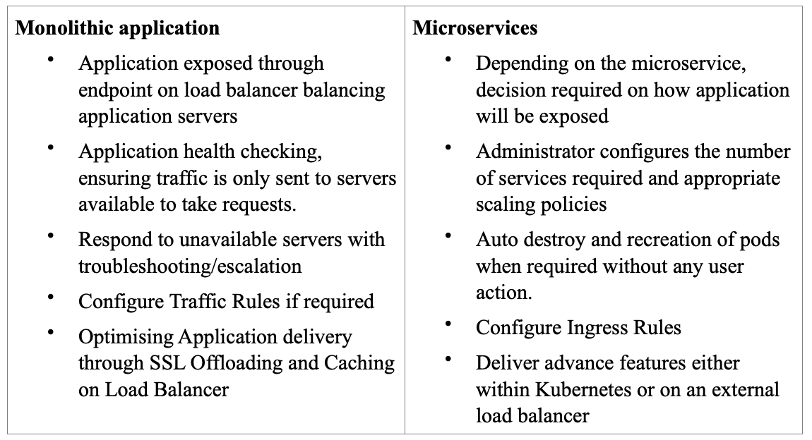 Die beschriebenen Änderungen bringen ihre eigenen Herausforderungen mit sich, wenn es darum geht, sicherzustellen, dass alle Benutzer jederzeit auf die Anwendungen zugreifen können. Bei herkömmlichen monolithischen Anwendungen ist ein Netzwerkadministrator in der Regel für die Bereitstellung einer Anwendung über einen Endpunkt verantwortlich, der in der Regel auf dem Load Balancing eines Load Balancers für die Anwendungsredundanz konfiguriert ist. Parallel dazu wird eine intelligente Zustandsprüfung durchgeführt, um sicherzustellen, dass der Datenverkehr nur an Server gesendet wird, die für die Bearbeitung von Anfragen verfügbar sind. Wenn Server nicht verfügbar sind, stellt die Redundanz sicher, dass die Anwendungsverfügbarkeit aufrechterhalten wird (zumindest bei einem allgemeinen Kapazitätsverlust), und die Fehlerbehebung/Eskalation wird ausgelöst, um die Gesamtverfügbarkeit zu gewährleisten. Anwendungen können durch SSL-Offloading und Caching optimiert werden, die normalerweise von einem Load-Balancer/Application Delivery Controller durchgeführt werden. Schließlich können Inhaltsregeln/Richtlinien konfiguriert werden, so dass bestimmter Datenverkehr an einen bestimmten Server gesendet wird, der in der Regel auf einem Pfad, Hostnamen oder Gerät basiert.