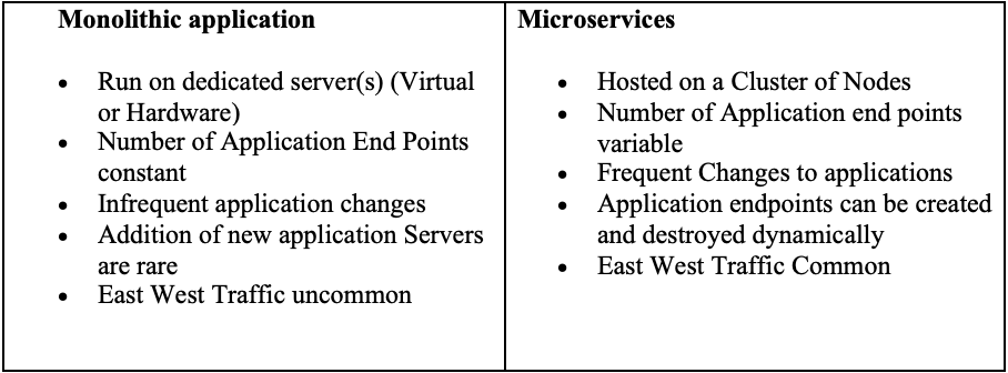 In der herkömmlichen (monolithischen) Infrastruktur laufen die Anwendungen auf verschiedenen Servern (virtuell, in der Cloud oder auf Hardware), und die Endpunkte der Anwendungen sind in der Regel die Server selbst (oder zumindest über eine eindeutige Portnummer auf einem Server bereitgestellt). Infolgedessen ist die Anzahl der Anwendungsendpunkte relativ konstant. Upgrades und Änderungen an diesen sind nicht allzu häufig und verursachen einige Verwaltungskosten, wie z. B. Wartungsfenster und/oder Verlust der Redundanz. Zusätzliche Server-Endpunkte werden hinzugefügt (vielleicht bei steigender Nachfrage), was jedoch nicht häufig vorkommt. Da die Anwendungen in sich geschlossen sind, wird außerdem der meiste Verkehr von den Clients zur Anwendung abgewickelt (allgemein als Nord-Süd-Datenverkehr bezeichnet), und es gibt weniger Verkehr von Anwendung zu Anwendung ("Ost-West-Datenverkehr") im Netz.