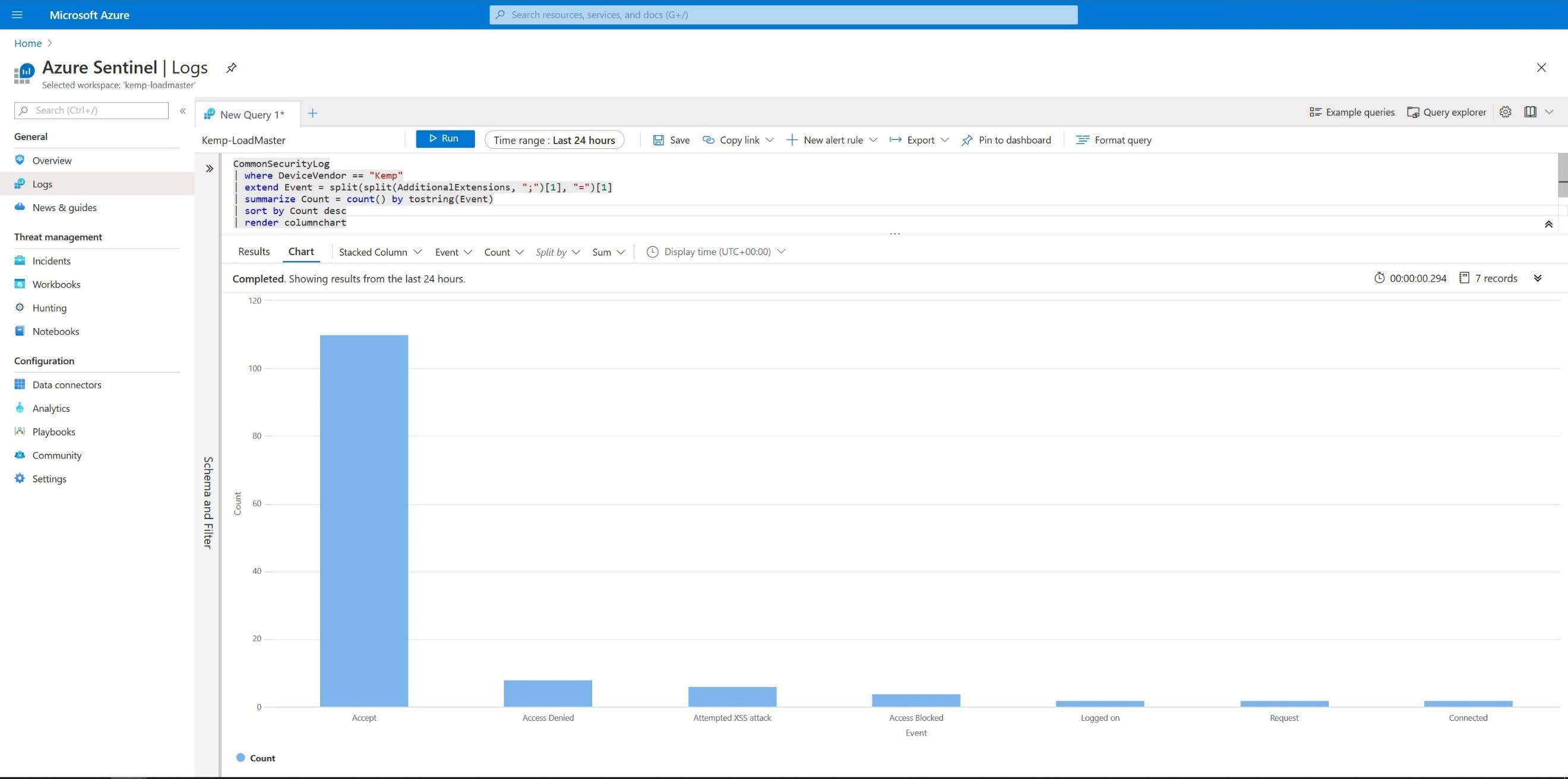 CommonSecurityLog | where DeviceVendor == “Kemp” | extend Event = split(split(AdditionalExtensions, “;”)[1], “=”)[1] | summarize Count = count() by tostring(Event) | sort by Count desc | render columnchart