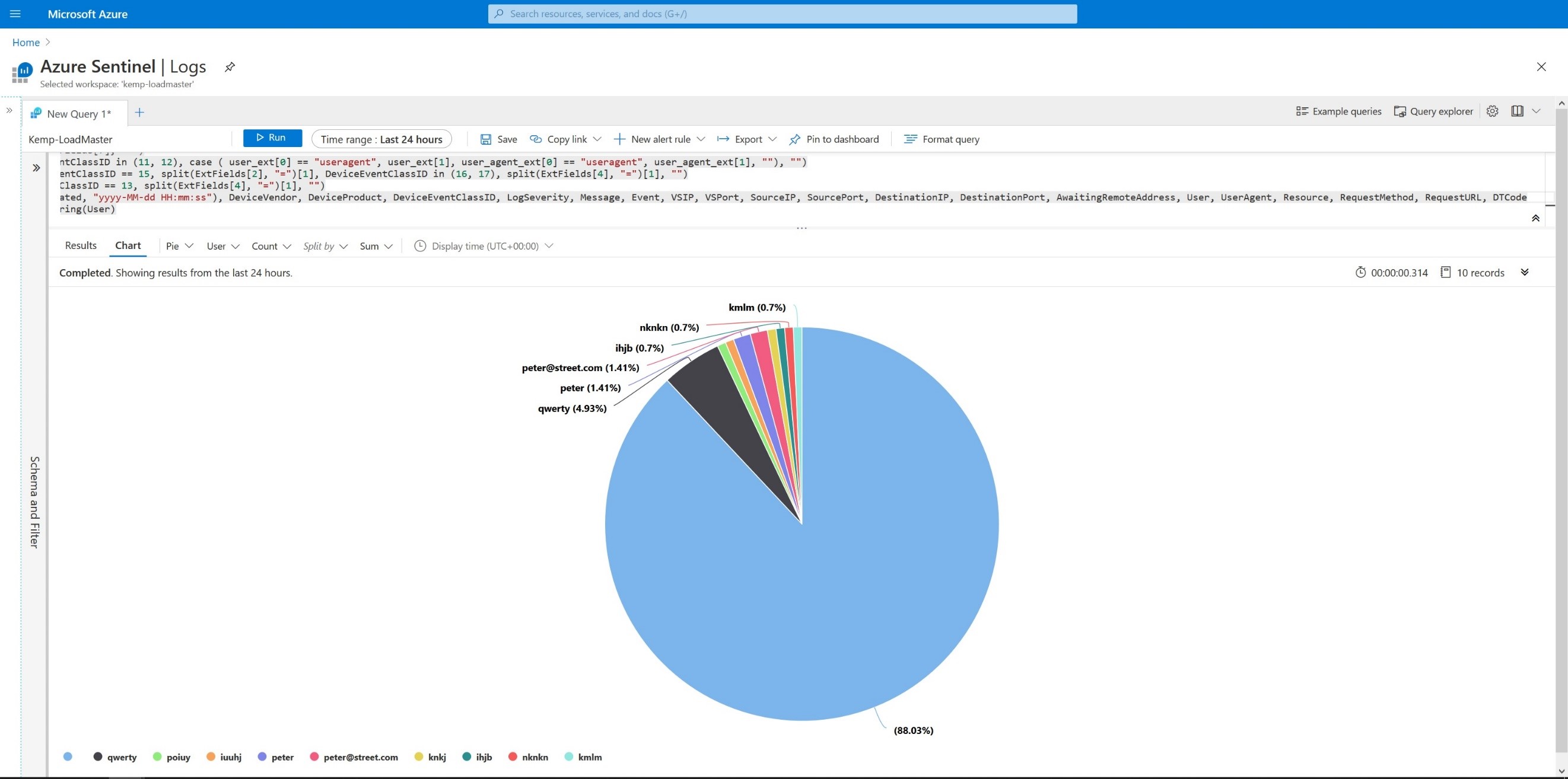 The Kusto language combined with the detailed information in the Kemp Technologies LoadMaster Edge Security Pack Common Event Format logs enables deep insight and visibility into authentication and authorization attempts in your network.