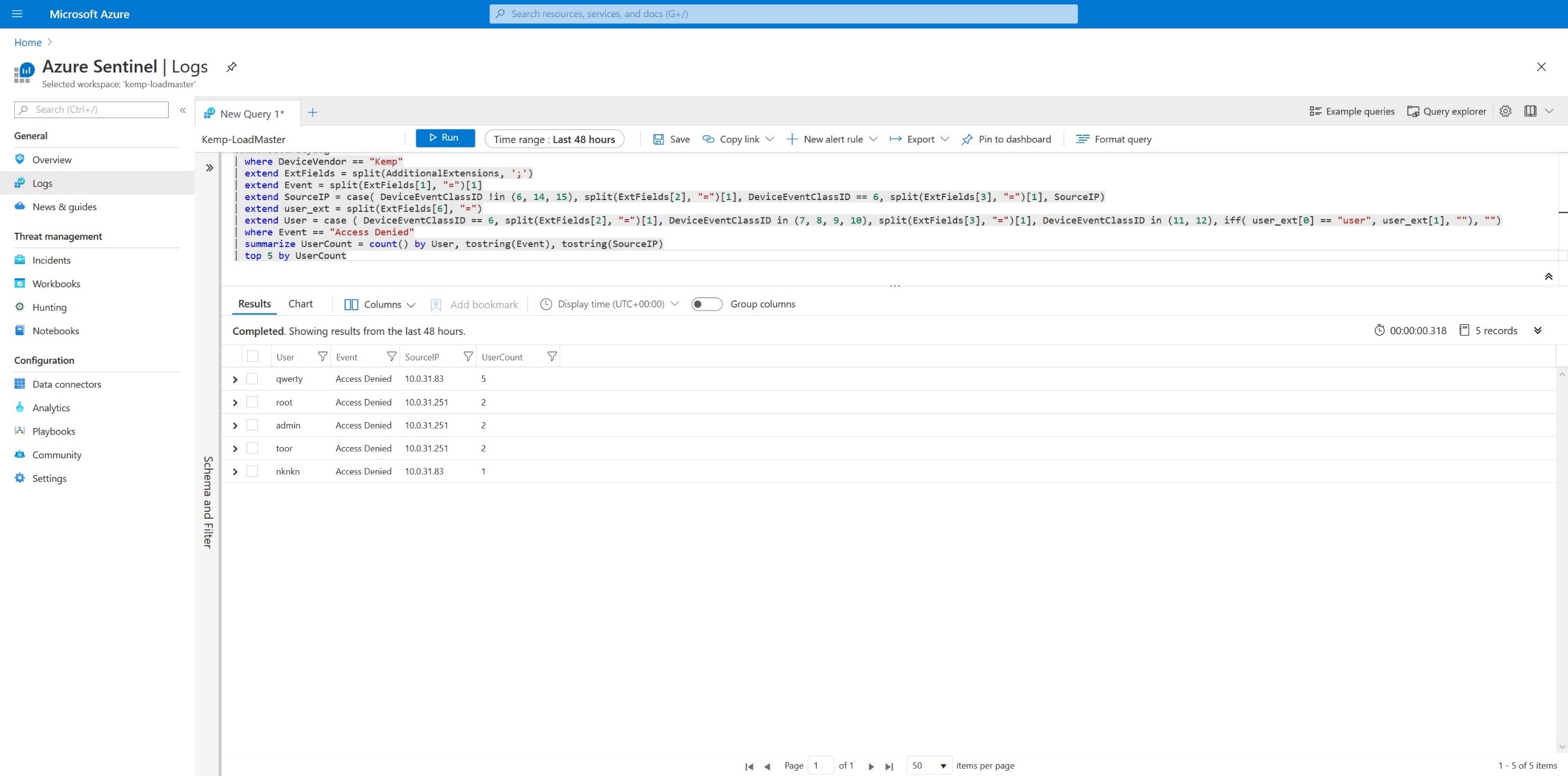 In this blog, I will demonstrate Kusto query language code that can be used to parse the Kemp Technologies ESP CEF logs to provide enhanced visibility of the authentication requests that the LoadMaster is receiving and the outcome. I am assuming that you have some basic knowledge of Azure Sentinel, have a workspace created with LoadMaster integrated and launched the Log Analytics workspace Logs Query, as shown in Figure 1 and in the video below.