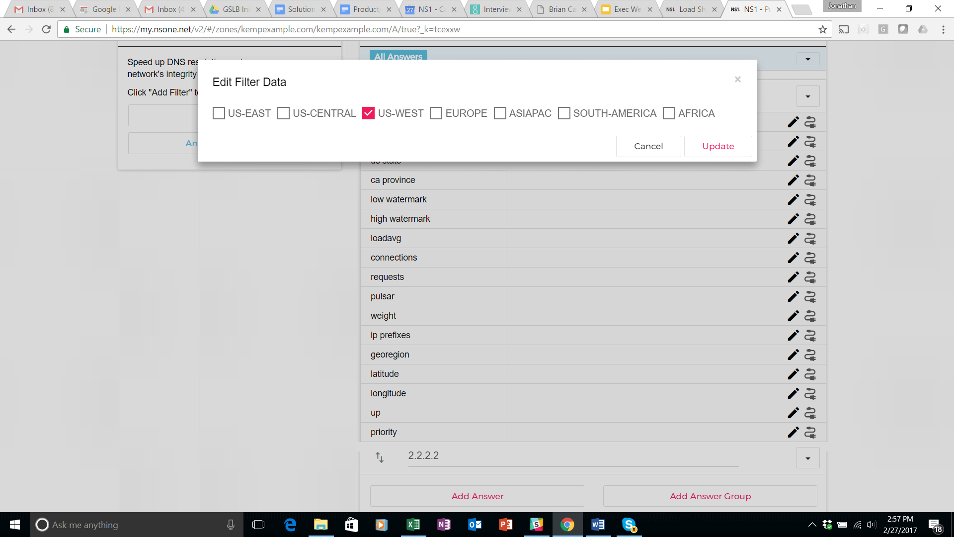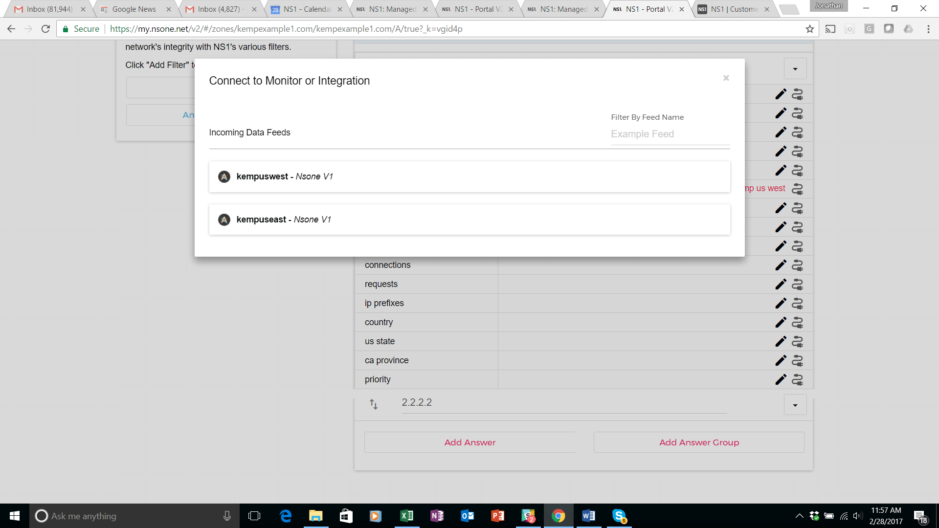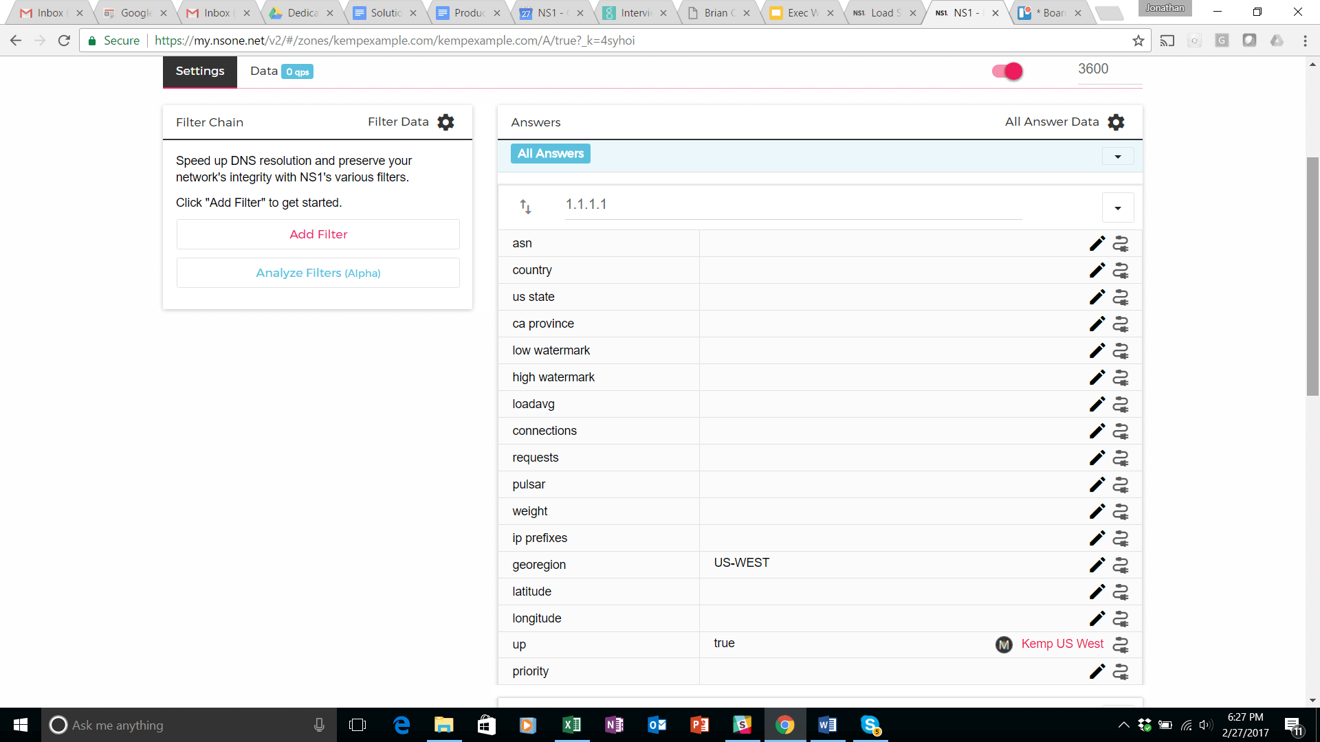 This step has created a unique URL (see screen shot above) that can be used to send data from an external source to the NS1 platform. This data feed will be connected to the answer (1.1.1.1) corresponding to the us west data center.