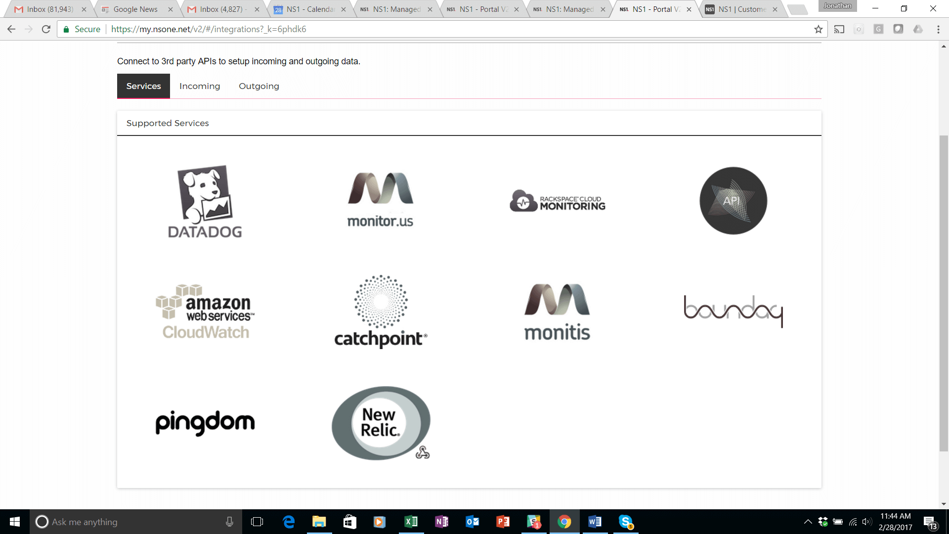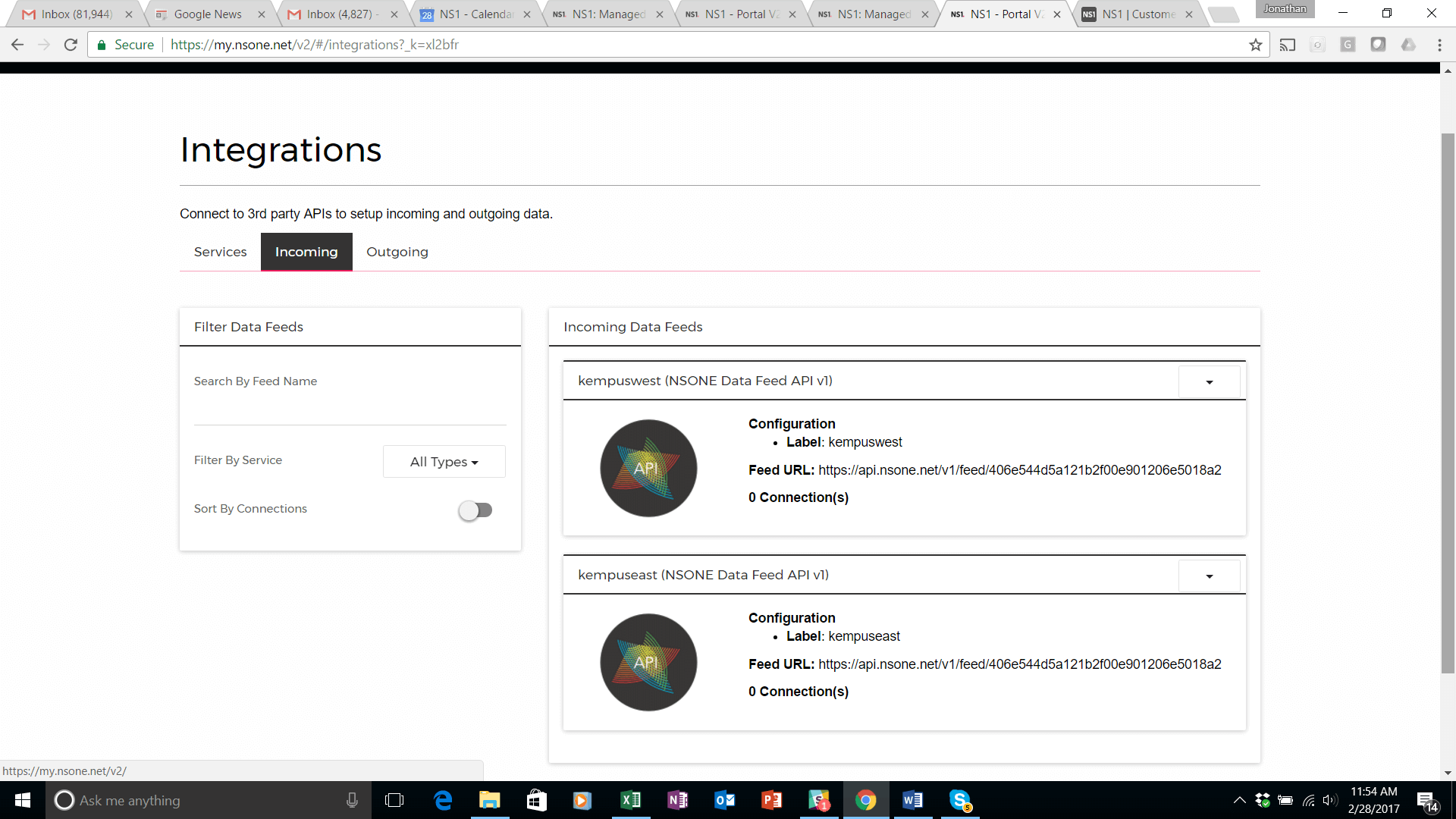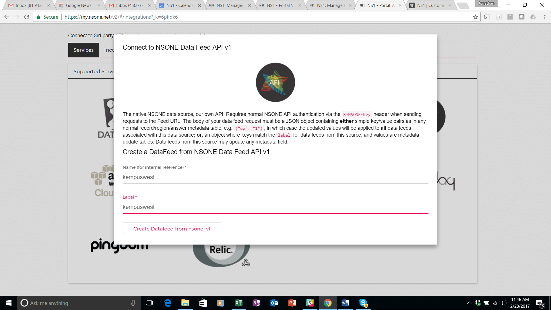 To set this up, navigate to the ‘Integrations’ tab of the portal, click on “Services” and click on the ‘Incoming Data Feeds’ with the API label. A config pop up will appear.