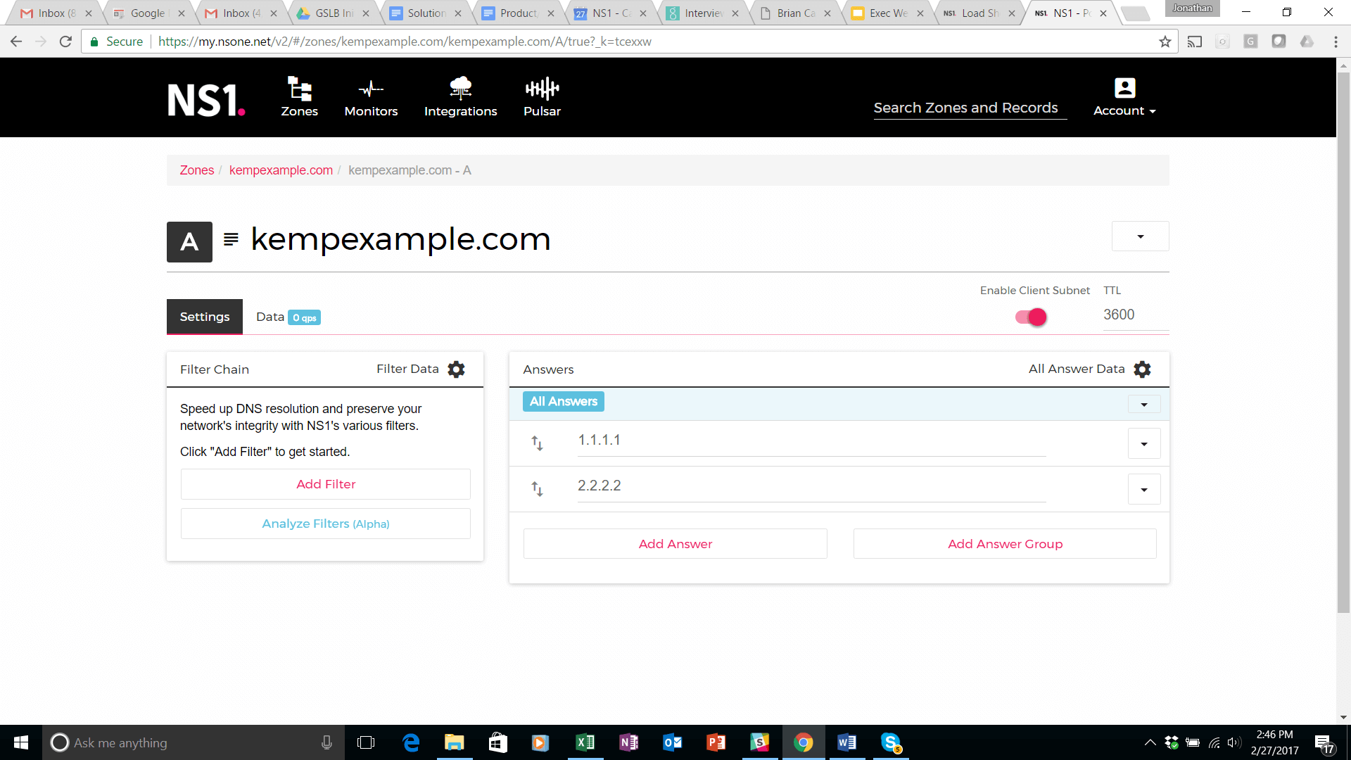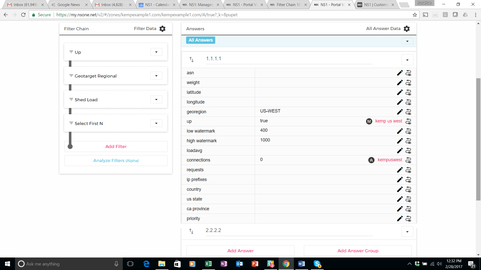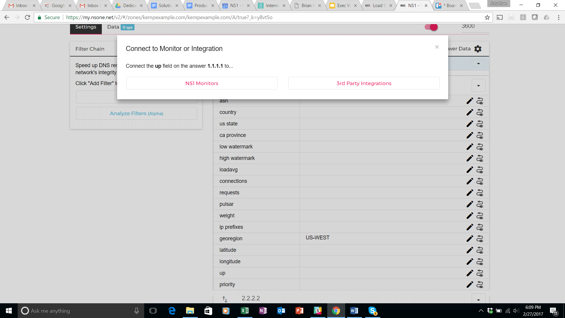 Select the NS1 Monitors from the pop up that appears at the top of your screen. Select the Kemp US West monitor. It will then appear in the UP setting of the 1.1.1.1 answer in the DNS record. Perform the same steps to create a monitor and attach it to the 2.2.2.2 answer (Atlanta data center).