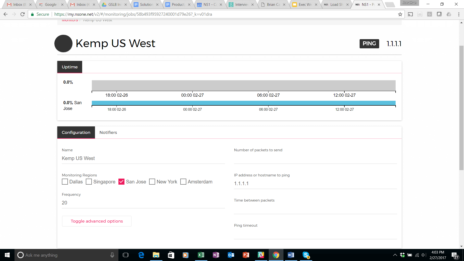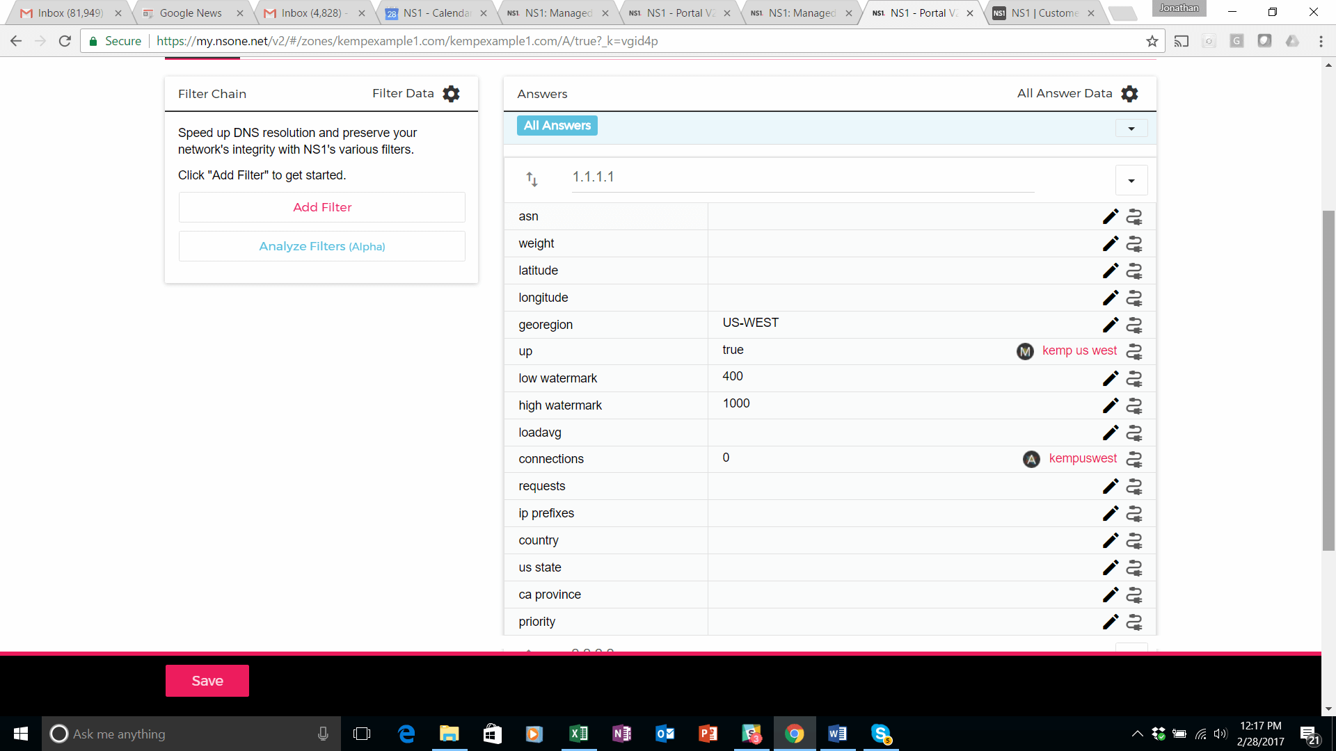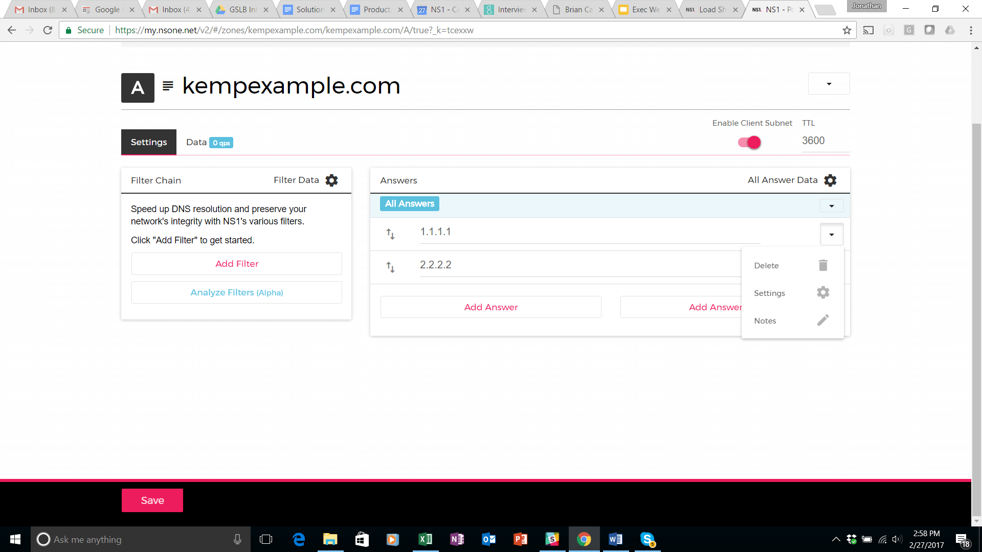 Select the NS1 Monitors from the pop up that appears at the top of your screen. Select the Kemp US West monitor. It will then appear in the UP setting of the 1.1.1.1 answer in the DNS record. Perform the same steps to create a monitor and attach it to the 2.2.2.2 answer (Atlanta data center).