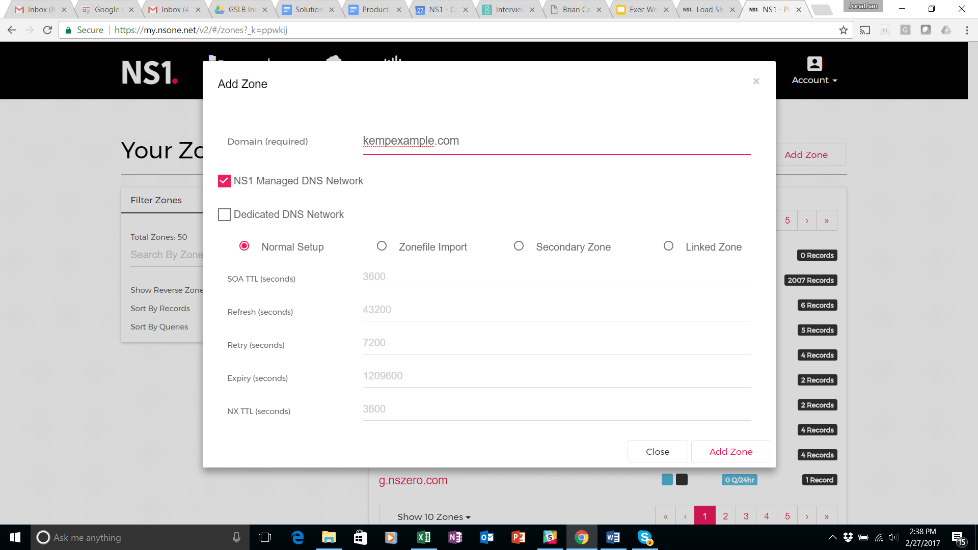 Select Add Zone. (Kempexample.com in this demonstration set up).