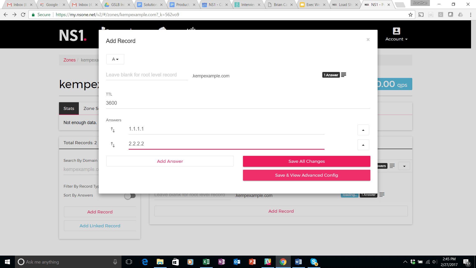 Your A record with 2 answers appears as shown below: