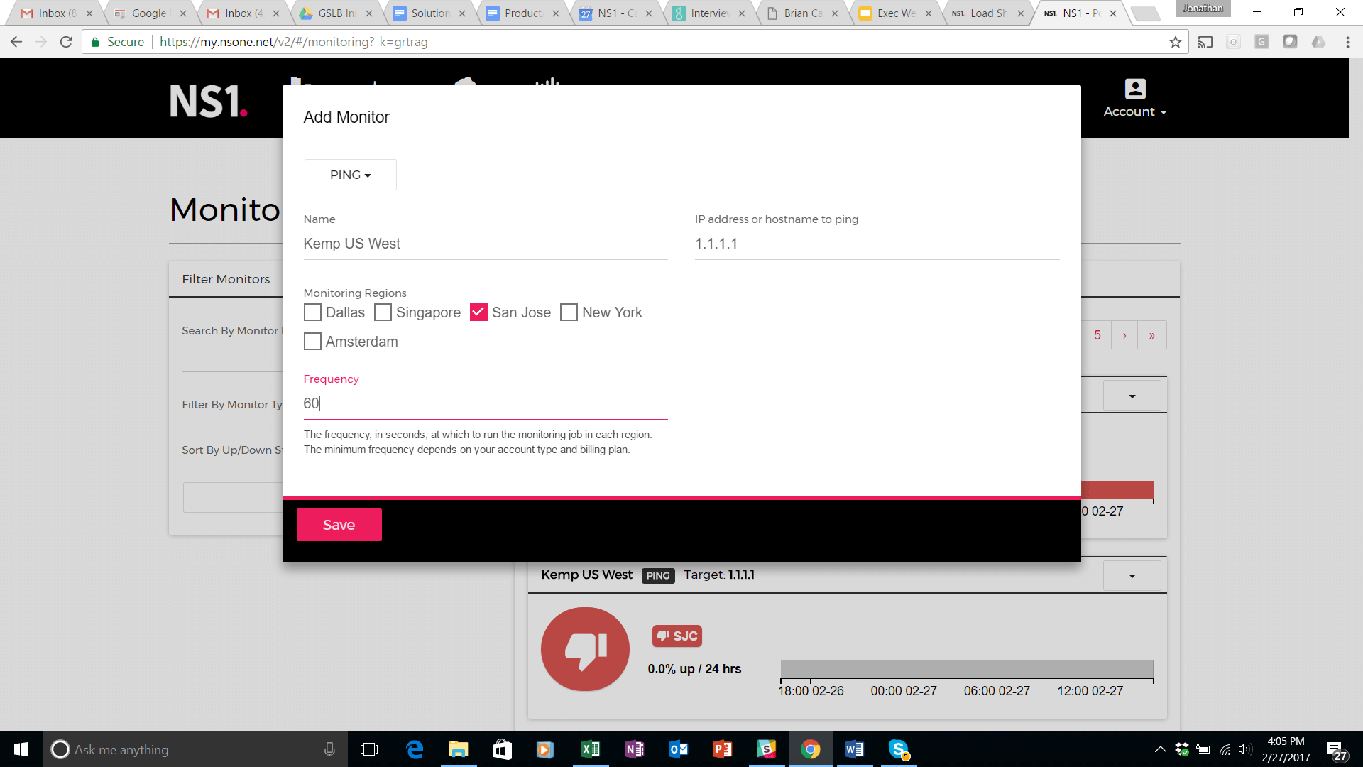 Next step is to attach dynamic (or real time) meta data to these answers. The first of these is up/down status. For that, we use the monitoring capability of the NS1 platform to PING the IP address of each Kemp load balancer and feed the result to the DNS answer. (If you use your own monitoring or a 3rd party monitoring service, consult the NS1 knowledge base to set up the configuration). First, navigate to the ‘Monitor’ tab at the top of the screen. Select Add Monitor on the next screen. Upon doing so, you can choose the monitoring protocol you would like to use. In this example, we are using PING. Configure the initial settings as shown below. We named it Kemp US West and we are monitoring with a frequency of 20 seconds in this example.