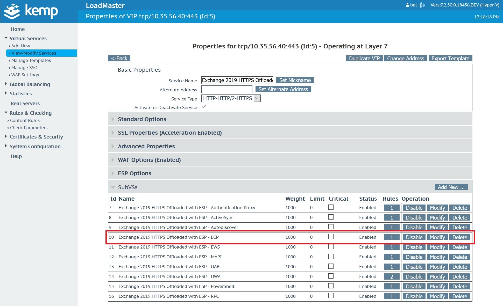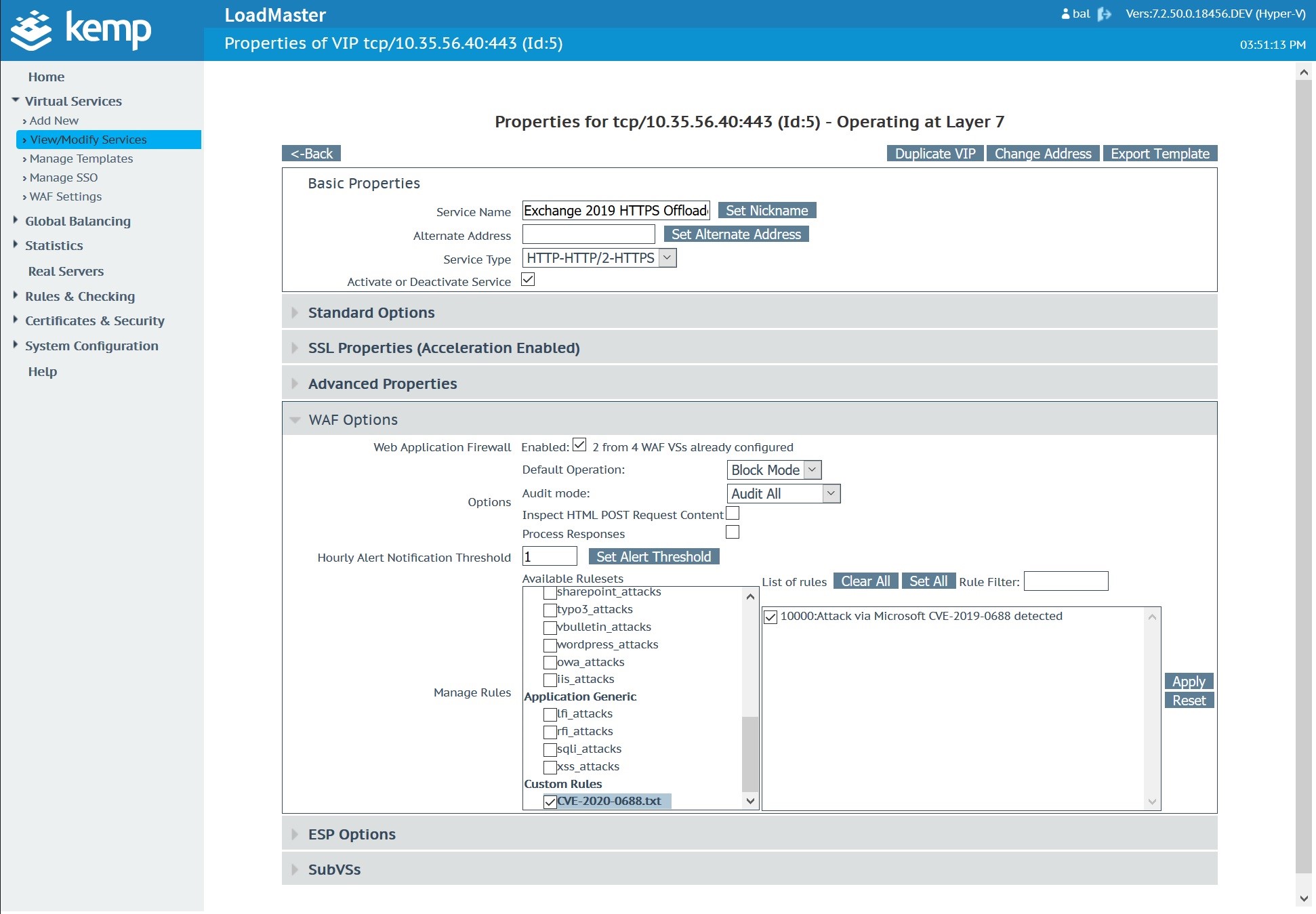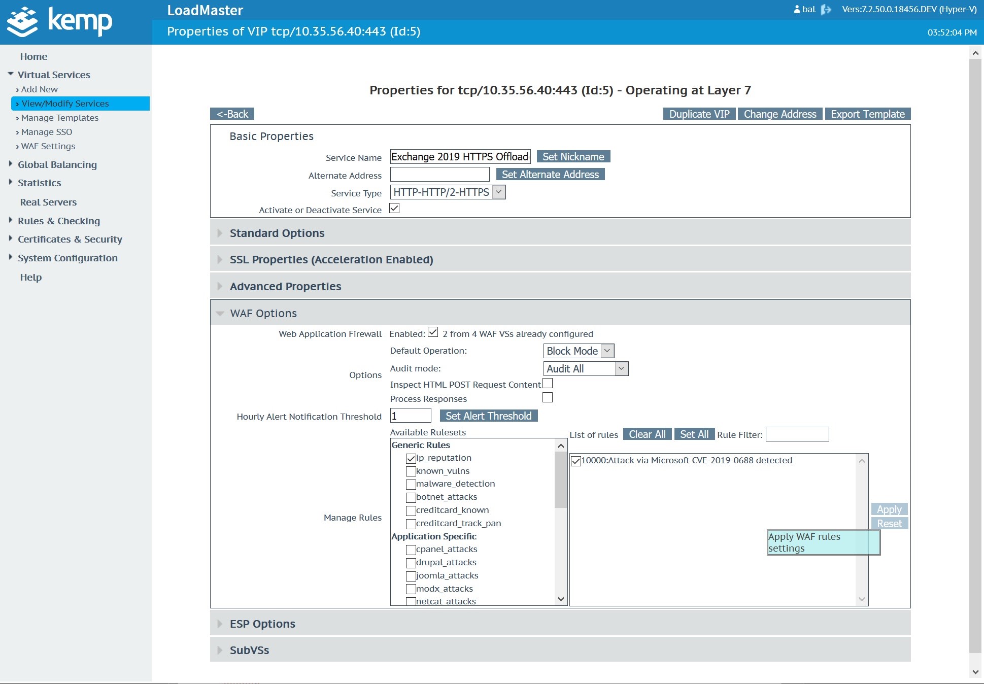 Once the custom WAF rule is uploaded and available, navigate to the Microsoft Exchange Virtual Service. In this case, the Microsoft Exchange Virtual Service was created with a Kemp Technologies Exchange 2019 template.