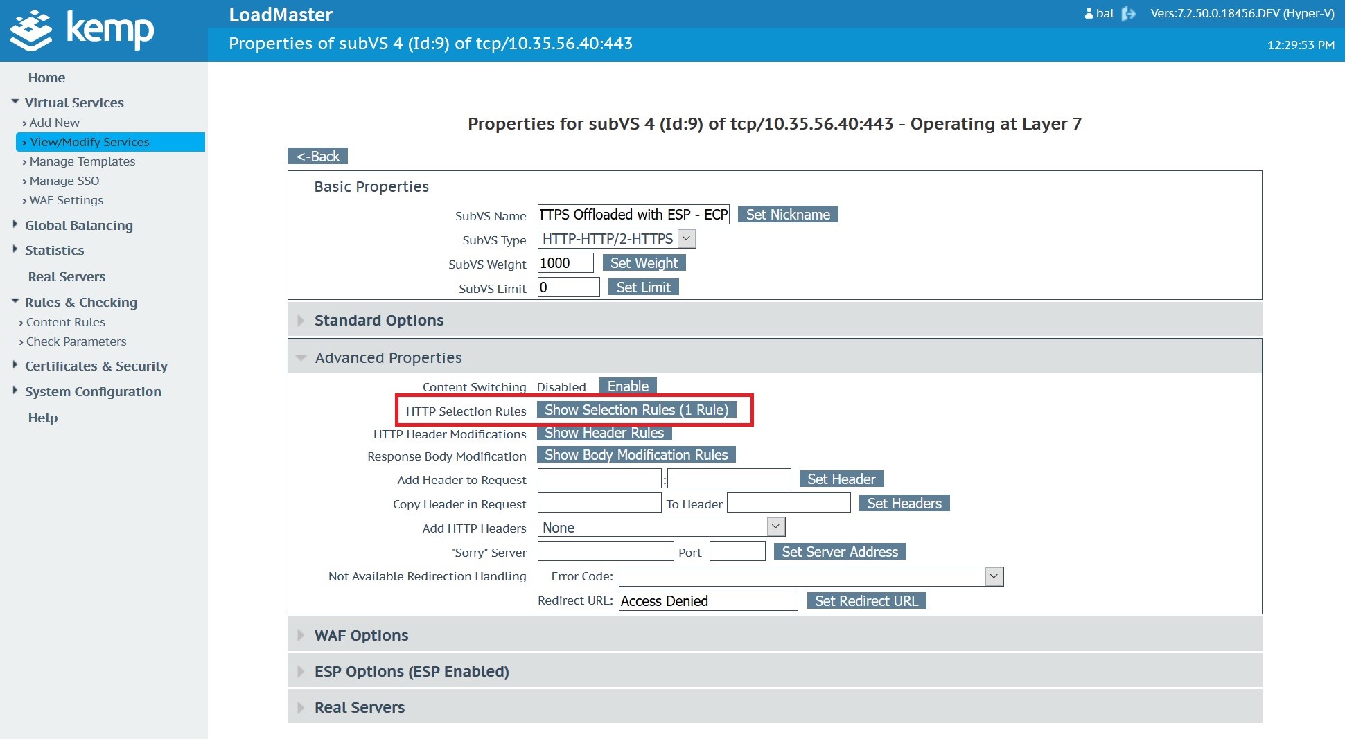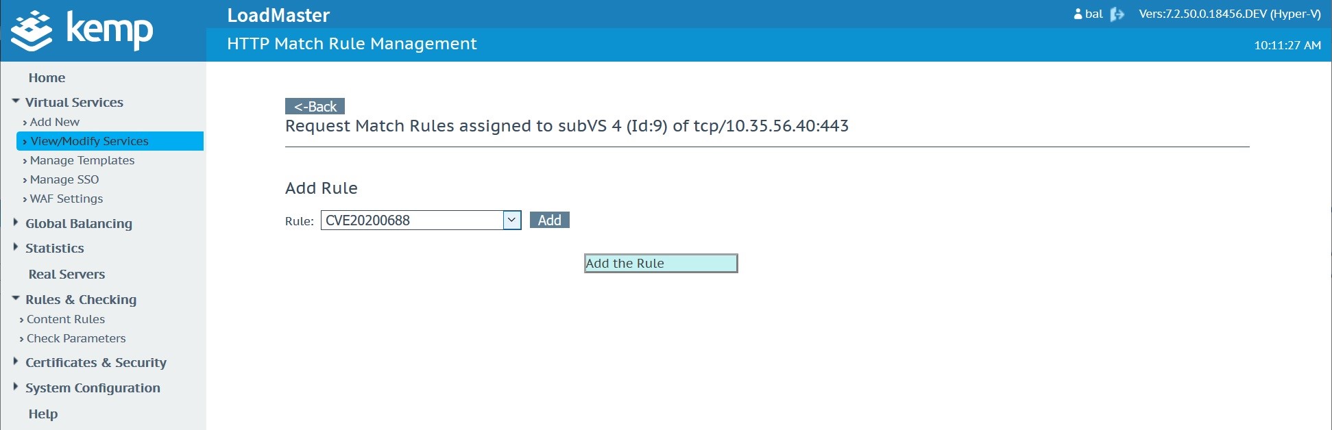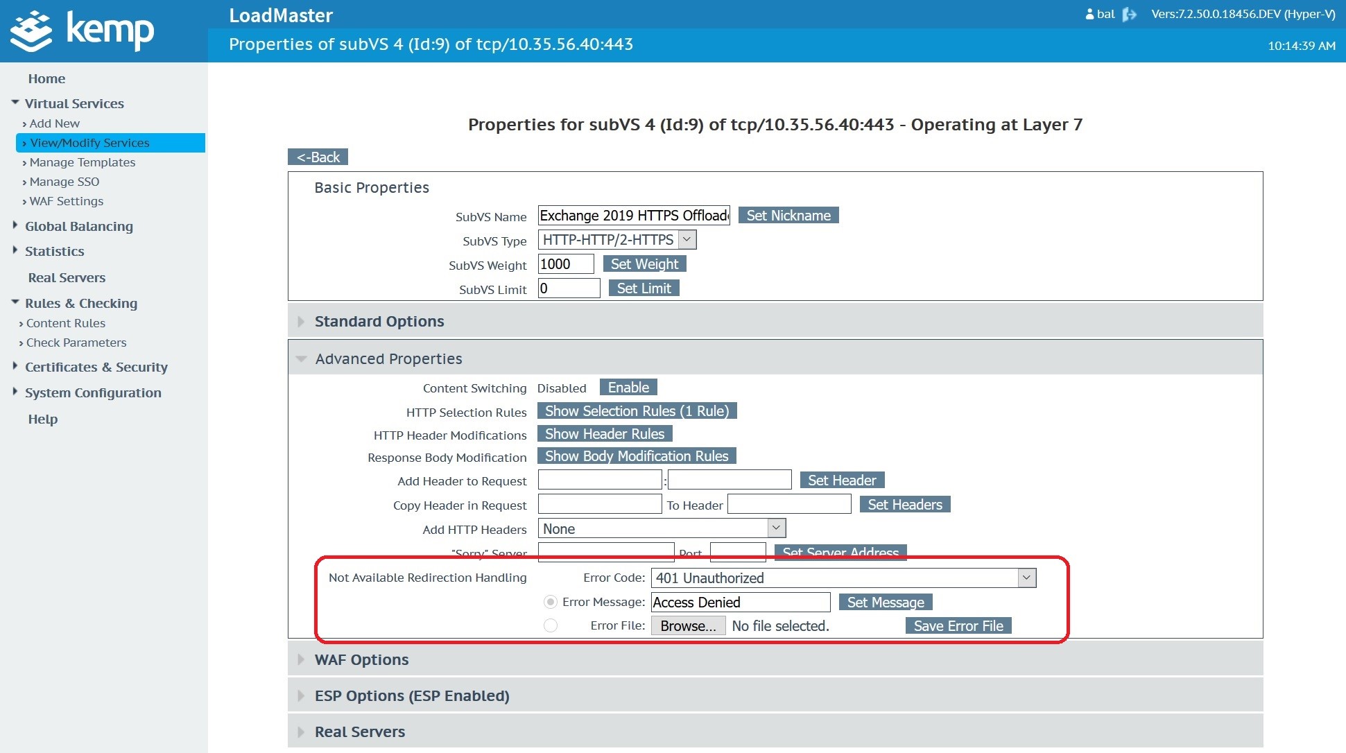 Once the custom WAF rule is uploaded and available, navigate to the Microsoft Exchange Virtual Service. In this case, the Microsoft Exchange Virtual Service was created with a Kemp Technologies Exchange 2019 template.