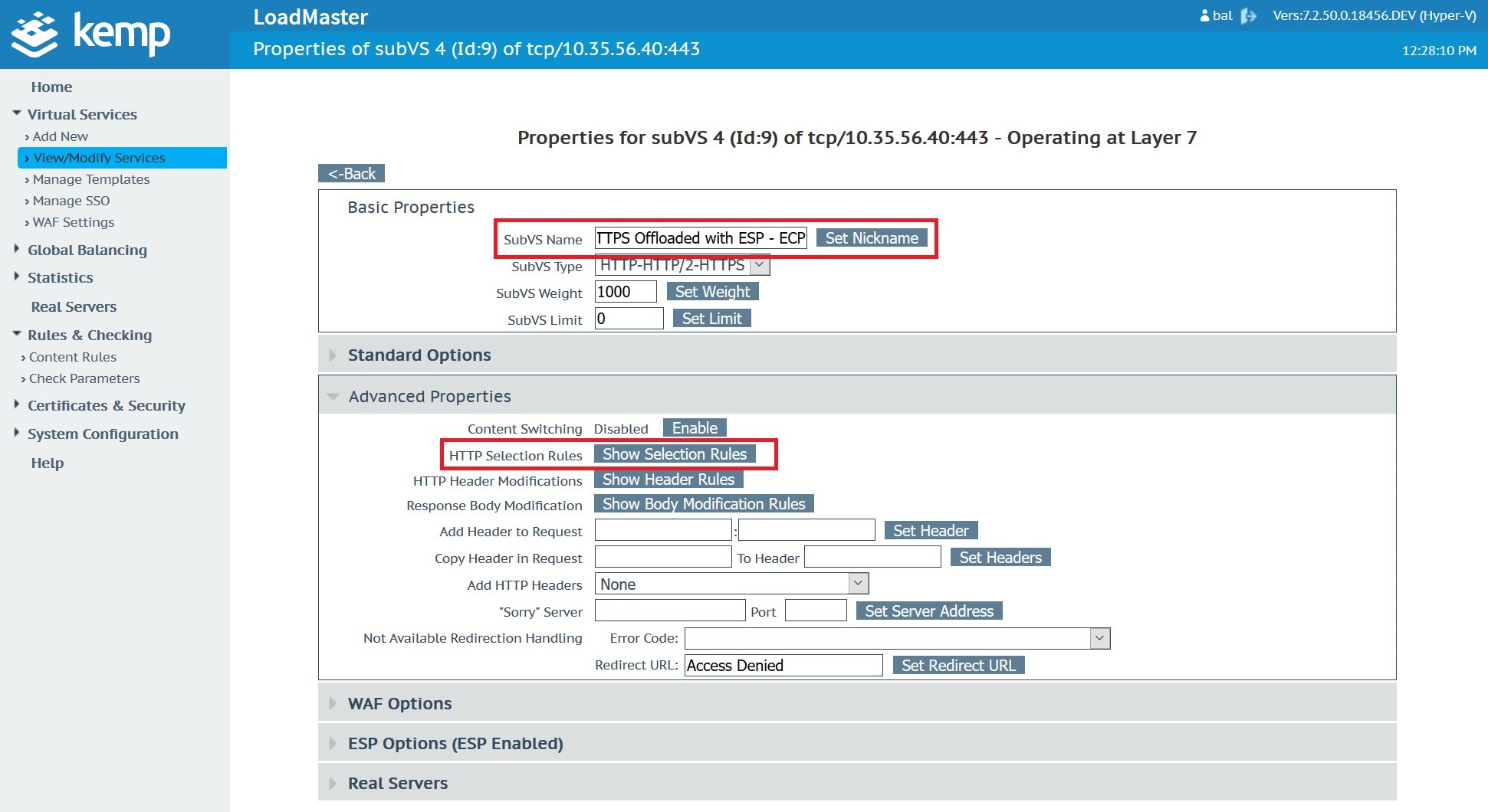 This content rule needs to be applied to the Microsoft Exchange Virtual Service and in specific the sub virtual service ‘Exchange 2019 HTTPS Offloaded with ESP – ECP’.
