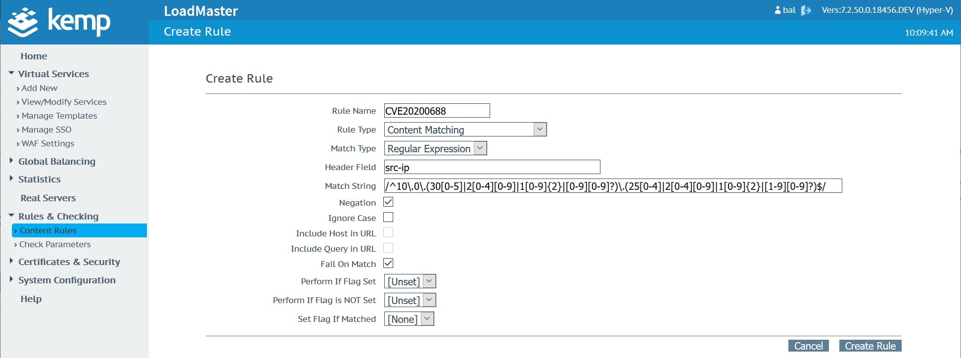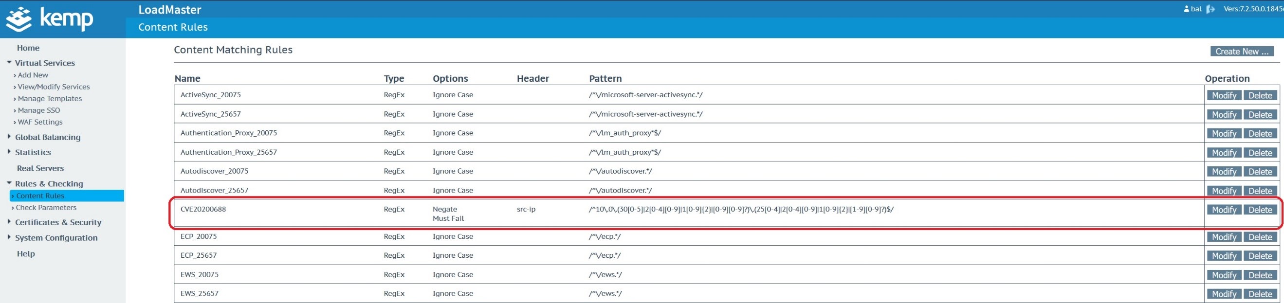 Create a new “CVE20200688” rule in the Content Rules menu which you’ll find under “Rules & Checking”. This will need to be a “Content Matching” rule type using the “Regular Expression” match type against the “src-ip” header field. Use the “Match String” shown in the table below which is basically looking for any attempts to connect to the service from the 192.168.0.1 to 192.168.255.254 IP address range. This would need to be updated to support the internal address range for your specific network.