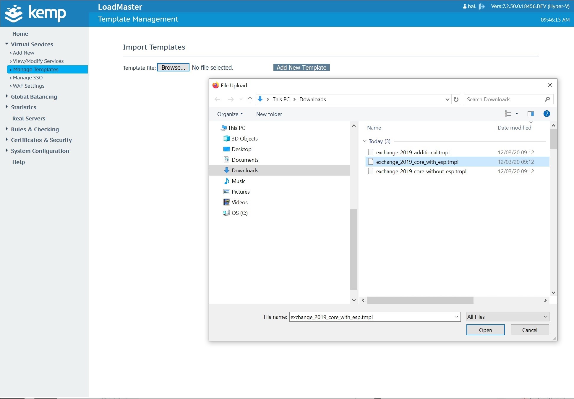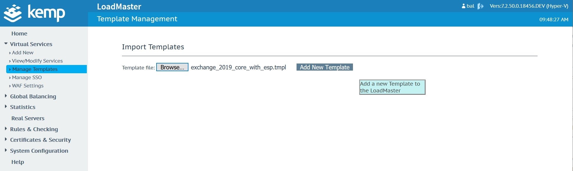 Import the template into your Kemp in the Manage Templates menu located under Virtual Services