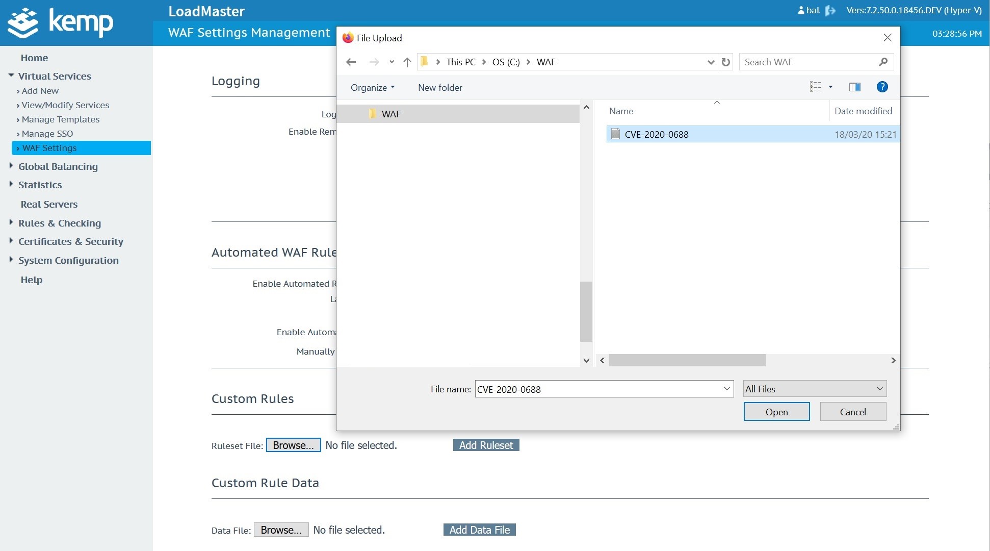This is added to a text file and uploaded to the Kemp Technologies WAF as shown: