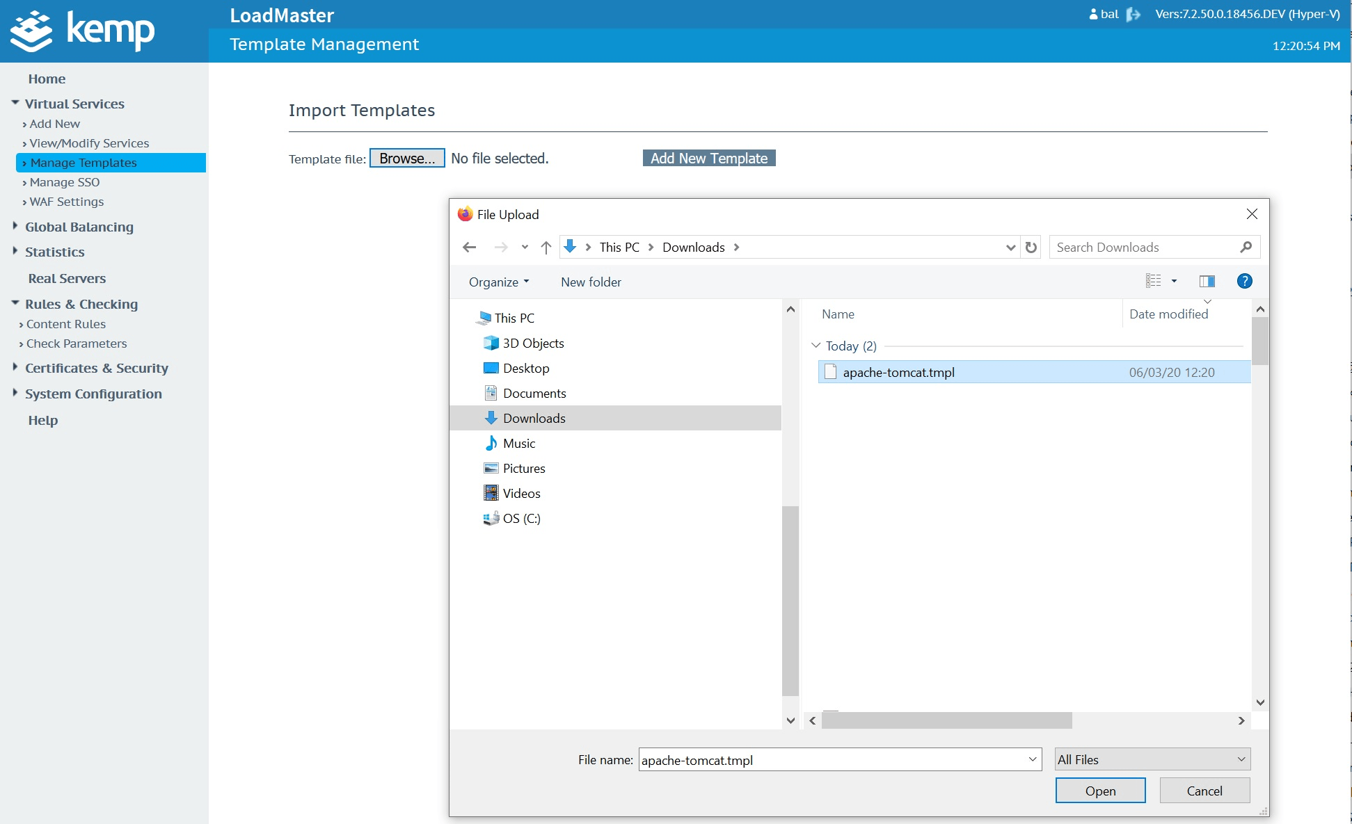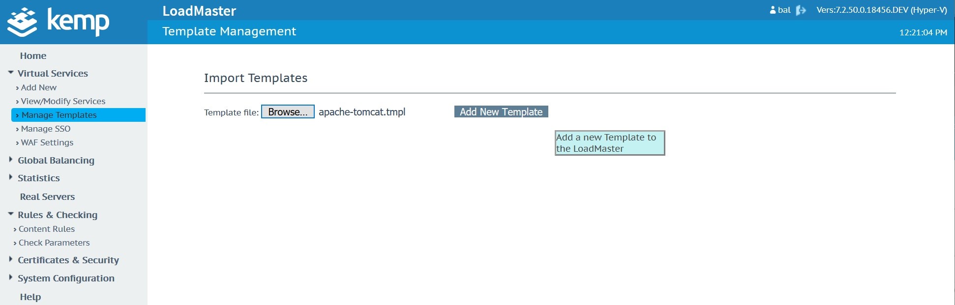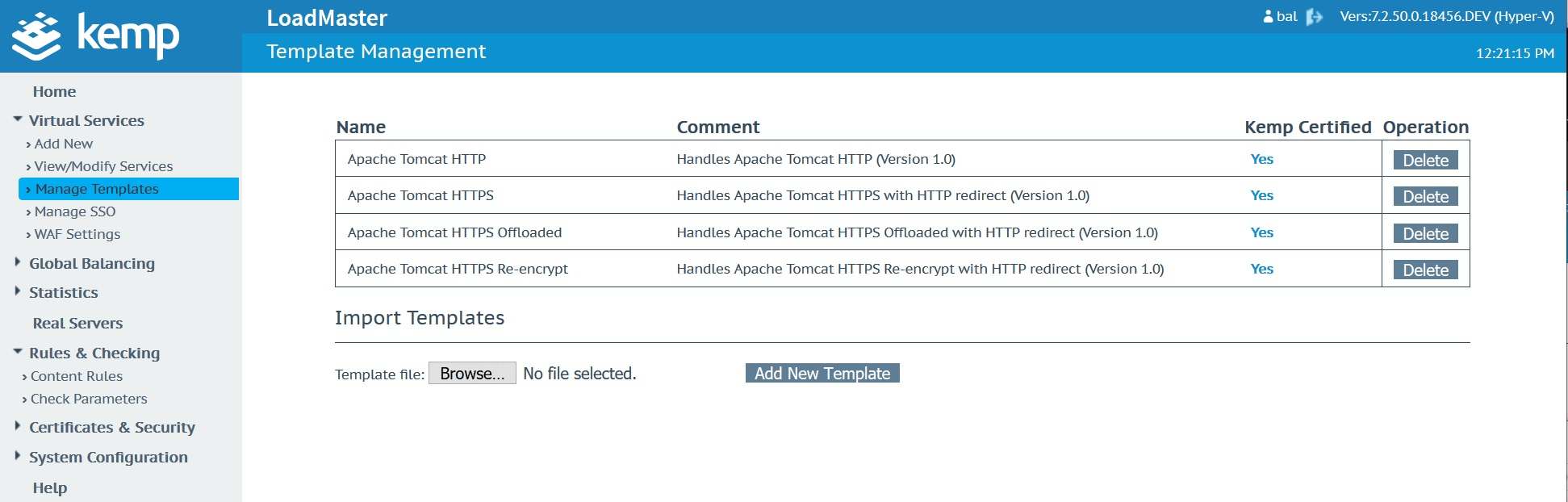 Download the Kemp Apache template hereImport the template into your Kemp in the “Manage Templates” menu located under “Virtual Services”.