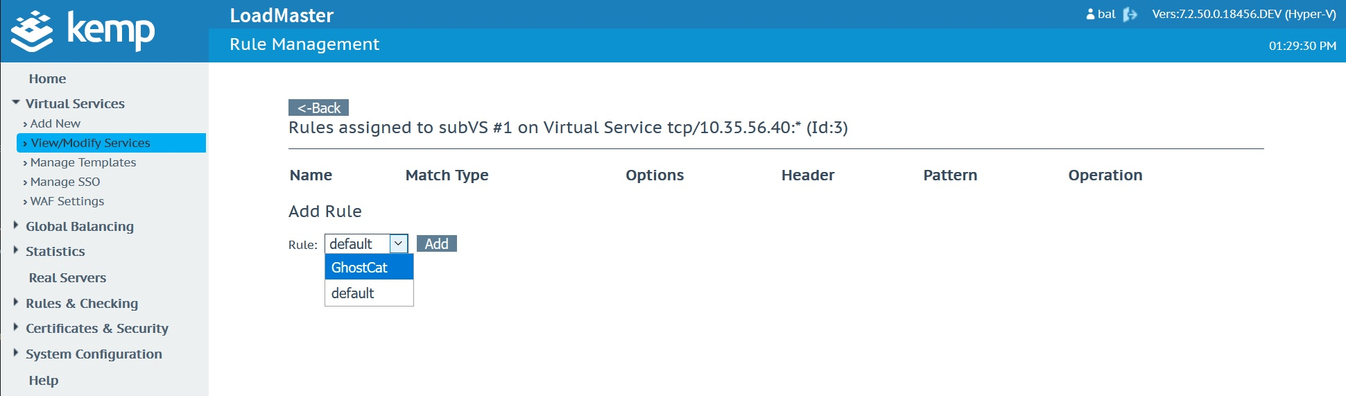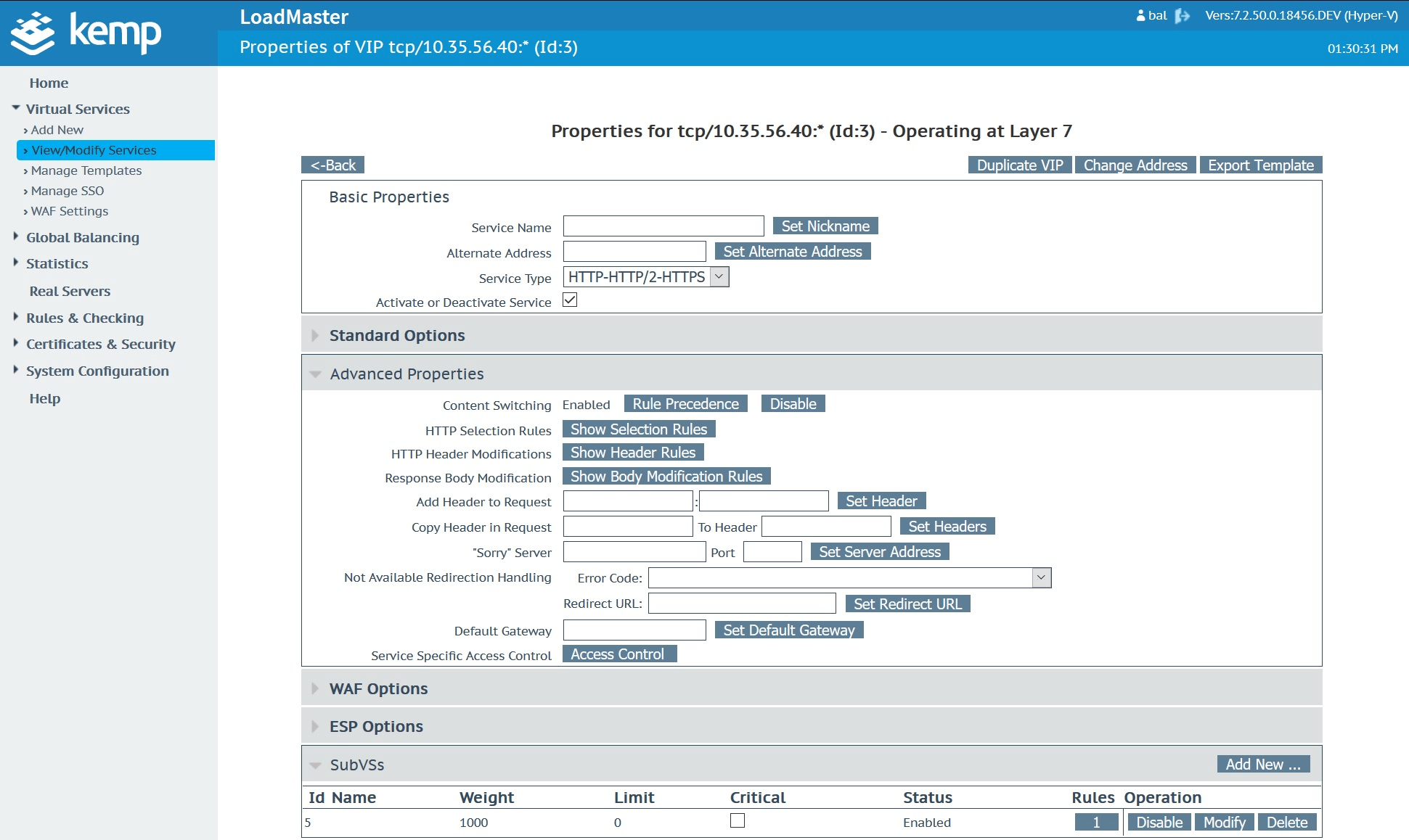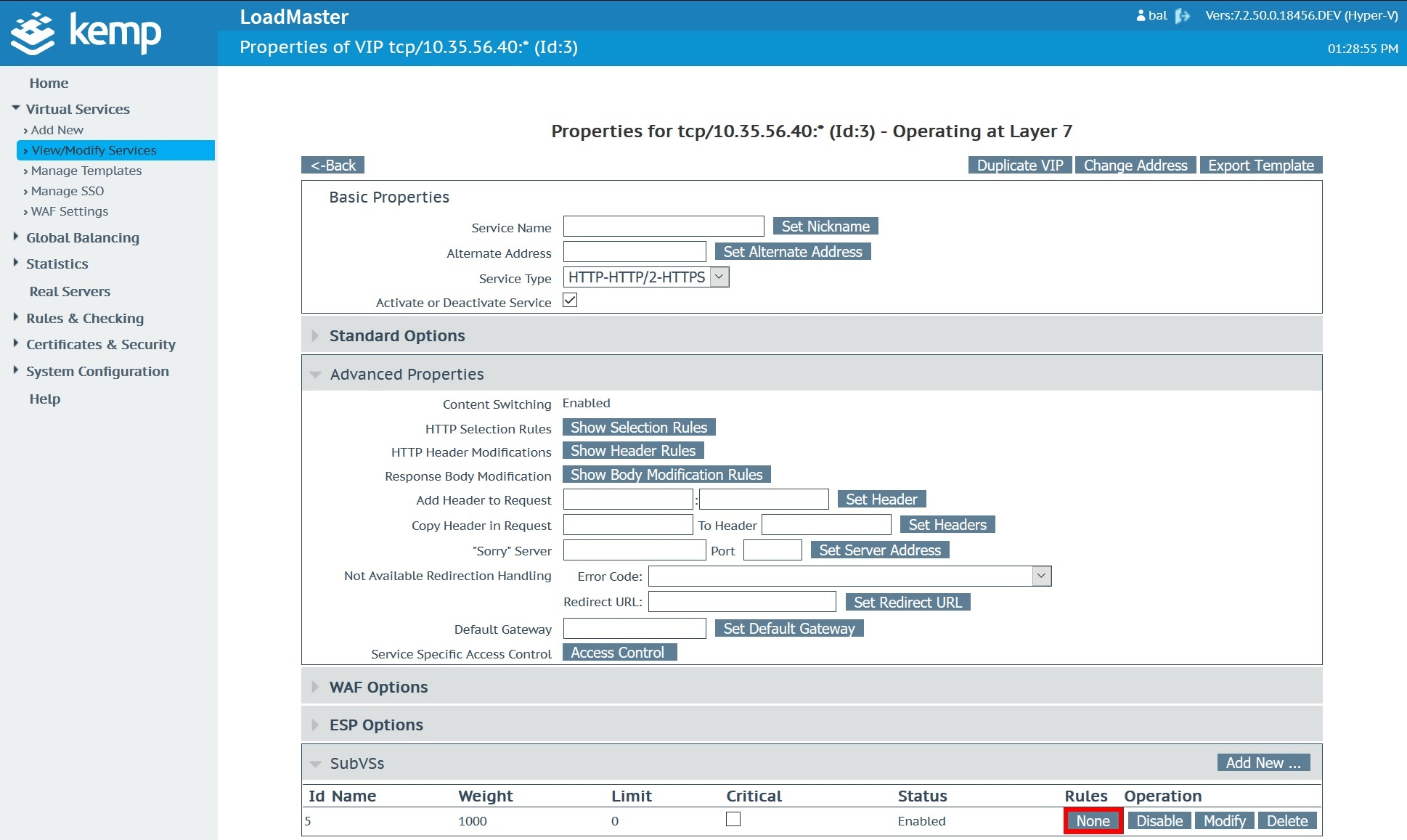 One key configuration consideration is that this approach assumes the use of sub-virtual services, referred to in Kemp’s UI as SubVS. Sub-virtual services enable complex application traffic routing and health checking combinations by putting the backend server targets into sub-groups. Logic and rules can then be applied to steer client requests or fail services based on a variety of logic options.