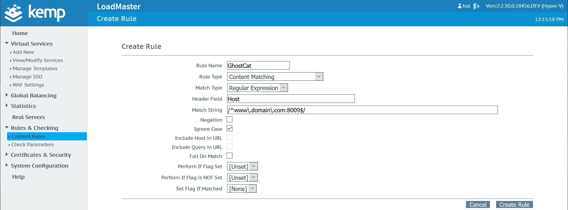 Create a new “GhostCat” rule in the Content Rules menu which you’ll find under “Rules & Checking”. This will need to be a “Content Matching” rule type using the “Regular Expression” match type against the “Host” header field. Use the “Match String” shown in the below screenshot which is basically looking for any attempts to connect to the service it gets applied to on port 8009.