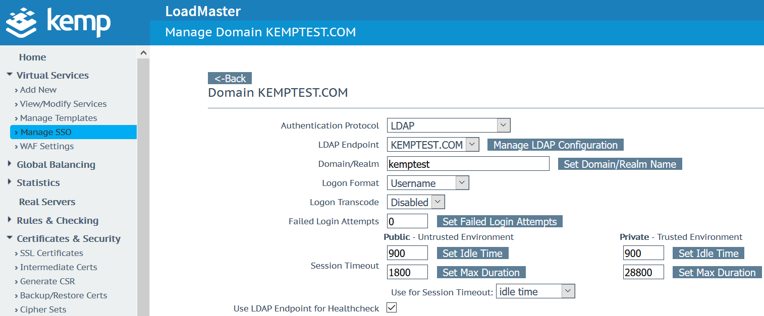 In der Netscaler-Umgebung definieren Sie eine Sitzungsrichtlinie, die sich an einen AAA-Authentifizierungs-VServer bindet, der schließlich an Ihren virtuellen Exchange-Server gebunden wird. Kemp LoadMaster verwendet eine ähnliche, einfacher zu konfigurierende Logik, bei der Sie ein Single Sign On (SSO)-Profil erstellen und es mit Ihrem Virtual Service oder Sub VS verknüpfen.