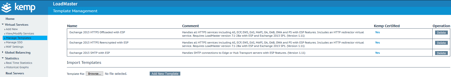 Um die Vorlage auf der Load Balancing Software vom Kemp Load Balancer zu importieren, navigieren Sie im Menü auf der linken Seite zu Virtual Services > Templates > Browse > Import .