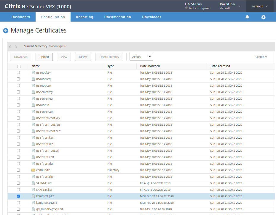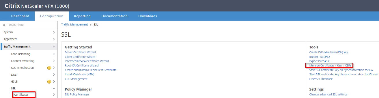 Navigieren Sie auf Ihrem Citrix Netscaler zu: Traffic Management > SSL, und klicken Sie auf Zertifikate / Schlüssel / CSRs verwalten.