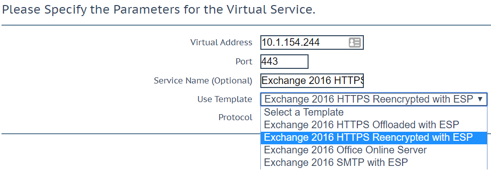 Navigieren Sie zu Virtual Services > Add New > Add IP > User Template > wählen Sie Exchange 2016 HTTPs Reencrypted with ESP aus.