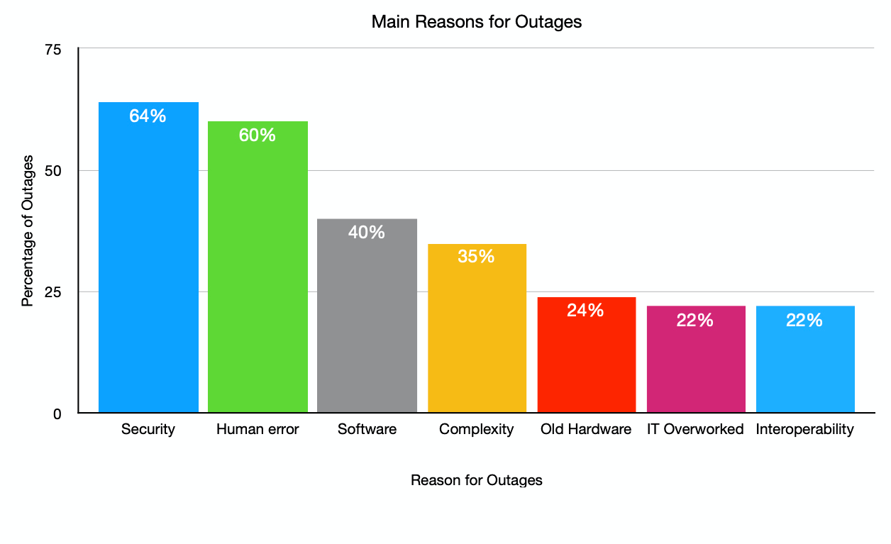 All these outage causes are related. Security attacks can be the result of human error when updating systems with patches. Or not updating them in some cases. Software faults that cause outages are often fixed in bug releases or upgrades that haven’t been deployed yet. Complexity in a systems UI is also linked to human error. Often it is not the human’s fault, as the UI on many systems is awful, especially on control systems for plant machinery and sophisticated operational technology (OT) that controls infrastructure.