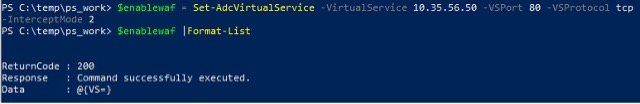 I will enable the WAF with InterceptMode set to ‘2’ and I will use the Set-AdcVirtualService command as shown in Figure 3.