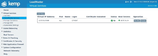 At this point, we can check the LoadMaster and see the Virtual Service, Real Server and WAF enabled with the default profile, as shown in Figure 4.
