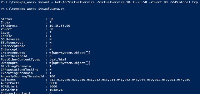Now that I have WAF enabled on the Virtual Service, I will outline all the PowerShell API parameters that are available. To check the current settings of the PowerShell API parameters, I will use the Get-AdcVirtualService command as shown in Figure 5.