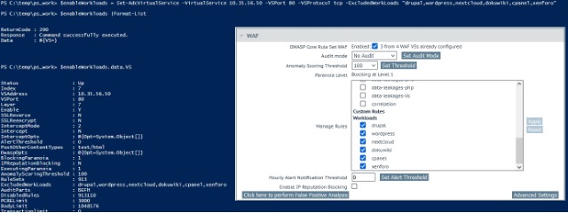 Workloads from the LoadMaster UI operates in the same way as RuleSets. The Drupal, Workpress, Nextcloud, Dokuwiki, Cpanel and Xenforo workloads can be enabled/disable via PowerShell API. This is shown in Figure 9, with the LoadMaster UI after the command is executed.