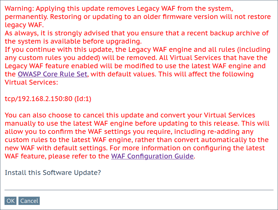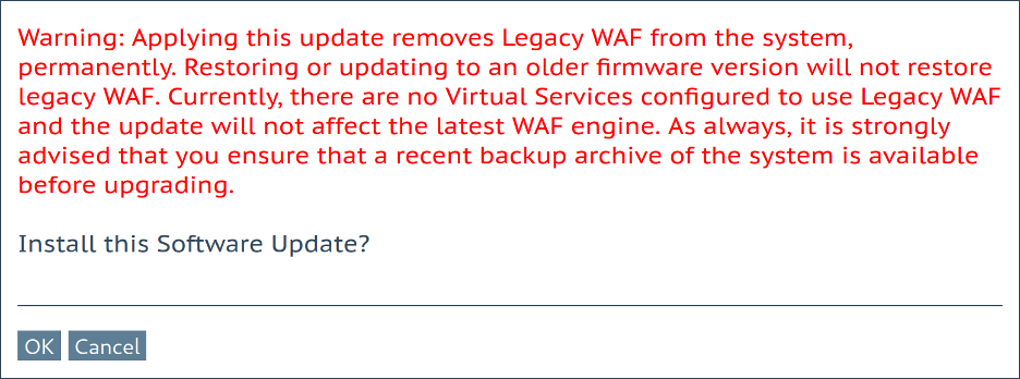 On a LoadMaster without “Legacy WAF” in use, the following pre-update dialog box is shown: