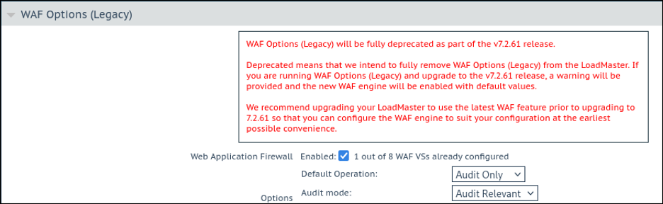 After updating a LoadMaster to LMOS Version 7.2.61.0, the “WAF Options (Legacy)” panel and its features and options are no longer available for new or existing virtual services, including virtual services with the “Legacy WAF” feature enabled before the update.