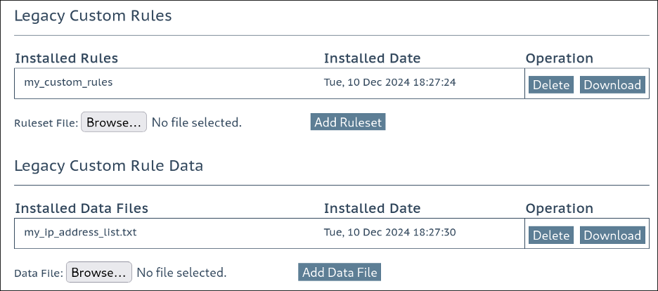 Suppose any “Legacy WAF” custom rule files or custom rule data files are present (navigate to Web Application Firewall > Custom Rules in the Web UI). In that case, it’s imperative to download them for safekeeping, as they will not be available after the update.