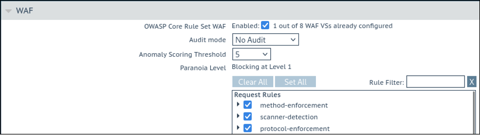 For existing virtual services with the “Legacy WAF” feature enabled, the replacement “OWASP CRS WAF” is automatically enabled in its place.